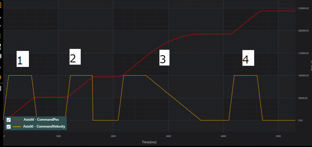 // 矩形プロファイルで動作:速度が目標速度に等しくなるまで、軸が一定の加速度で加速します。軸が目標位置に近づくと、軸は目標に正確に停止するタイミングで一定の減速度で減速を開始します。