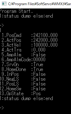軸の制御と状態は、WMXの標準ツールConsoleTOOLでも確認することができます。自作アプリと並行で使うことができますので、デバック時には起動しておくことをお勧めいたします。