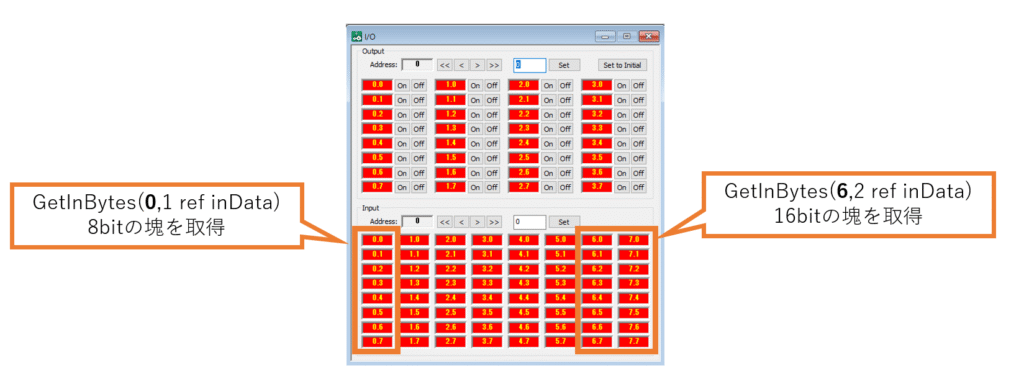 この関数は、1接点の値を読み取るのではなく、まとめて読み取る命令になります。引数は、GetInBytes(読み取り位置,取得サイズ,データを入れる配列)になります。